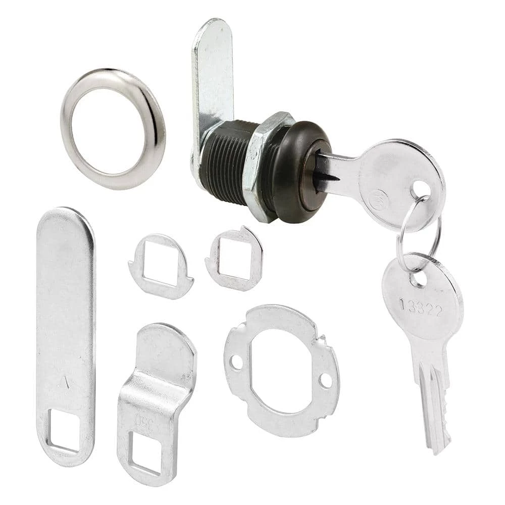 This drawer and cabinet lock is constructed of die-cast and steel components and it comes in a classic bronze finish. This lock feature a 3/4 in. outside cylinder diameter with a 1-1/8 in. length that will accommodate up to 13/16 in. thick panels. This drawer and cabinet lock can be mounted to metal or wood: doors and/or drawer panels, and it comes complete with 3 cams, a trim collar, 2 reversible rotation washers, 2 keys and fasteners. This model number is keyed different and it uses Yale Y-11 keyway.