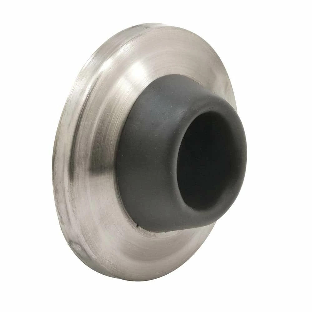 This is a wall mounted door stop. The brushed stainless base is 2-1/2 in. in diameter and the rubber bumper is 1-1/8 in. in diameter. The entire wall stop projects out from the wall 1 in. It has a stamped brushed stainless base and a concave bumper that conceals the fastening screw. The screw installs through the retainer plate and into a wall anchor.