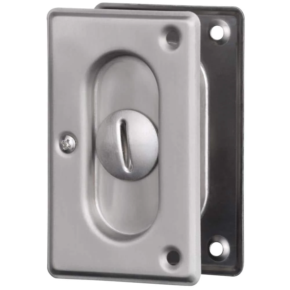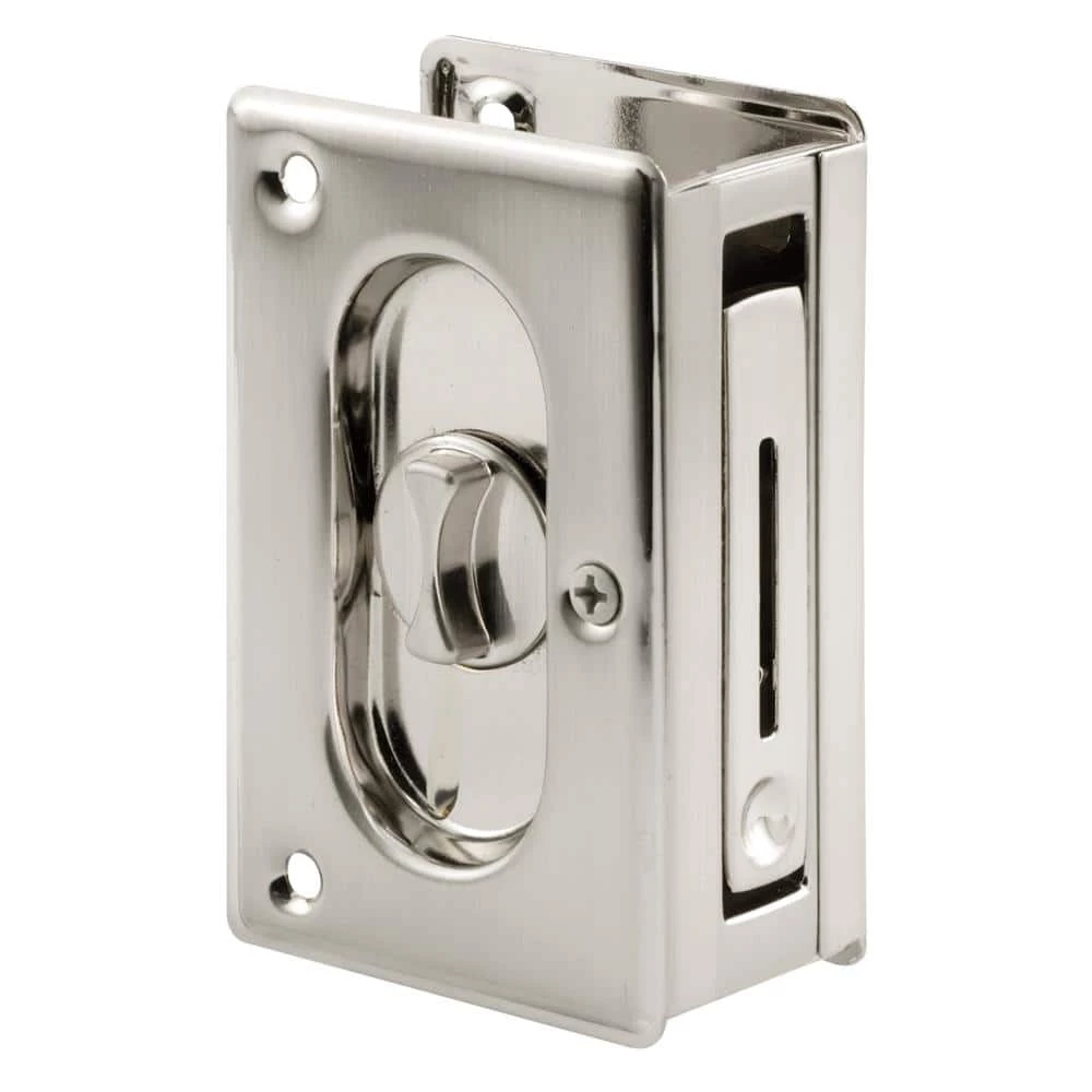 This is a privacy lock and pull for a pocket door in satin nickel. These are designed to fit pocket doors from 1 3/8 in. to 1 3/4 in. thick. They are also designed to be reversible.