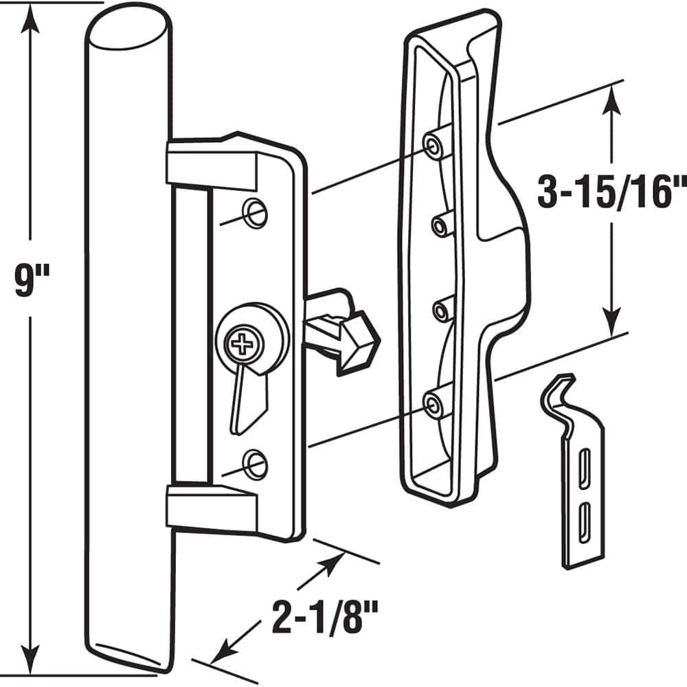This handle is a gray Internal style latching patio door handle found on Viking as well as a variety of other sliding patio door manufacturers. Being one of the most common internal style latch it can be used on either right or left handed doors. The handle body is diecast steel with a wood handle attached. The wood finish may vary slightly. Included is a matching outside handle and keeper. The mounting holes are 3-15/16 in. on center. When the latch is installed into the door frame through an inside access hole, the connected lever is held in place by a flat spring as it operates the latch up and down to engage the keeper.