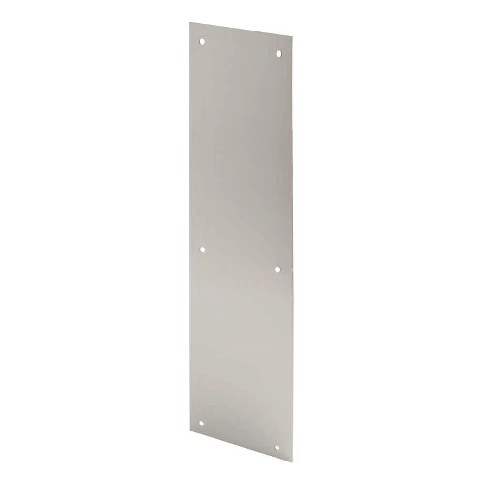 This is a 4 in. x 16 in. stainless door push plate. It features pre-punched mounting holes and includes necessary mounting hardware. This plate has a removable PVC protective coating.