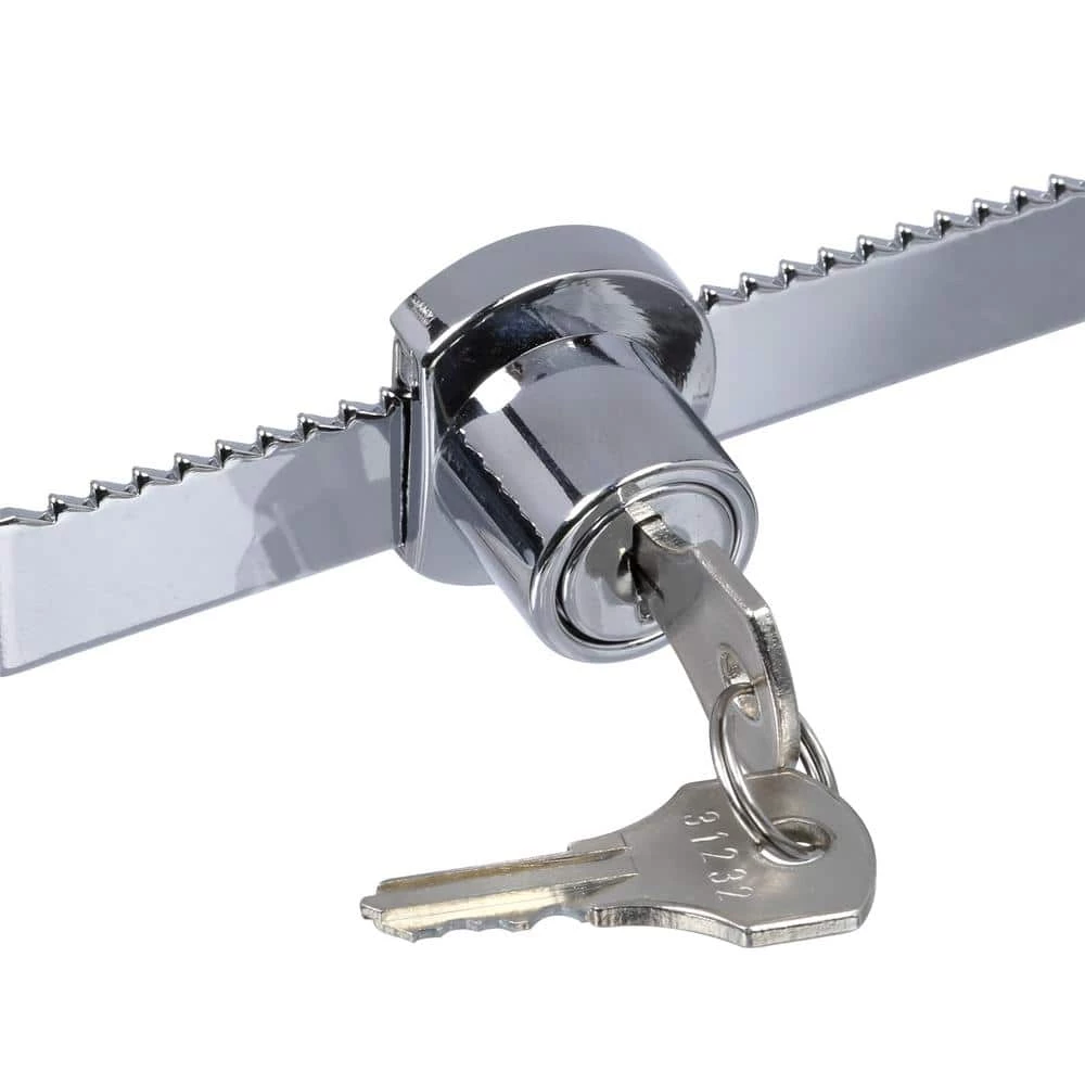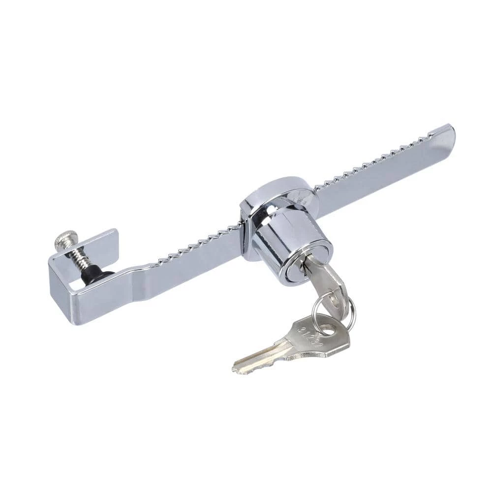 This showcase and pass-thru window lock is constructed of steel and diecast metal components. Comes in a chrome plated finish. It features a 9/16 in. tall locking bar that extends 5-1/2 in. L, and it can fit on showcase glass panels up to 5/16 in. thick. This lock is fully adjustable to accommodate a variety of various closing alignments. It is easy to install, and uses an ILCO 1000X keyway. Keys are included with locking device.