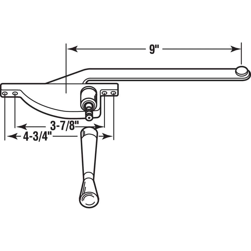 This casement window operator is a left handed aluminum square body type . It has a 9 in. steel arm with a round disc on the tip (some older styles had a small wheel instead of a disc). The disc slides in the Prime-Line part H 3529 casement track located on the bottom of the casement window. It is worm gear driven by a 3/8 inch crank spindle. The matching crank handle that fits onto the crank spindle and installation screws are included. Mounting holes available are 3-7/8 & 4-3/4 inches apart.
