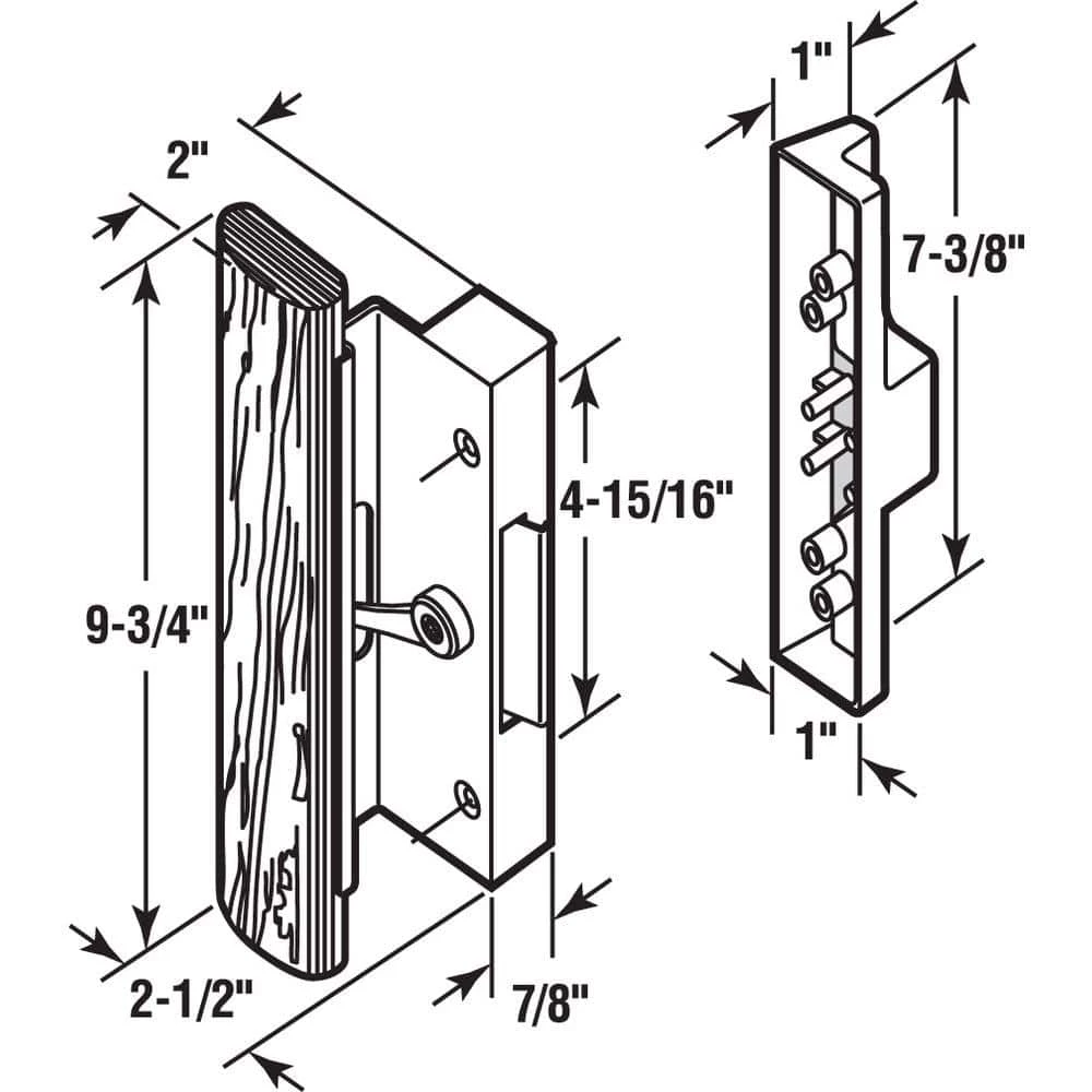 This is an upgrade from the typical clamp handles. The inside handle has a wood handle attached to a black bracket and has a height of 2 in. from the door frame. The outside handle is black diecast. The clamp latch has a clamp profile of 1/4 in. and a clamp projection of 1/2 in. in the locked position. The handle has 4-15/16 in. on center mounting holes. It is non-handed and can be used on right or left handed doors. It is non-keyed. Order Prime-Line part E 2000 to key this unit. Minimum door width of 7/8 in. and maximum of 1 in.