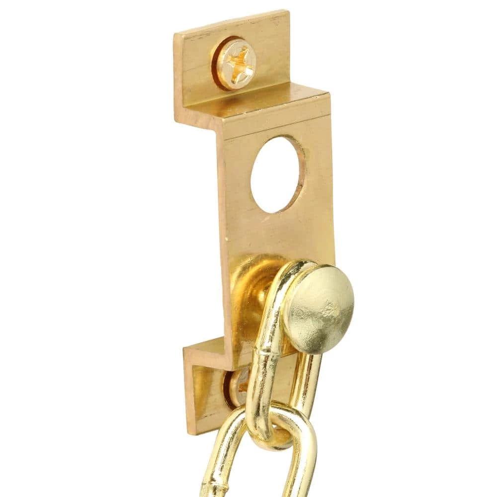 This door chain lock is a security locking device for doors. It allows a door to be slightly opened to allow safe viewing and ventilation. It can also be placed out of reach of children, high on a door, so they cannot open the door themselves and enter or exit into dangerous areas. This chain door guard is constructed of extruded brass with a polished finish and a 6-in., 8-link welded steel chain. It is strong and durable, sure to last, and installation is quick and easy. All installation fasteners are included, and it can be used on a variety of door types over or beside door casing. When this chain door guard is fully assembled and engaged, the chain will extend to 4-5/8 in. from base to keeper.