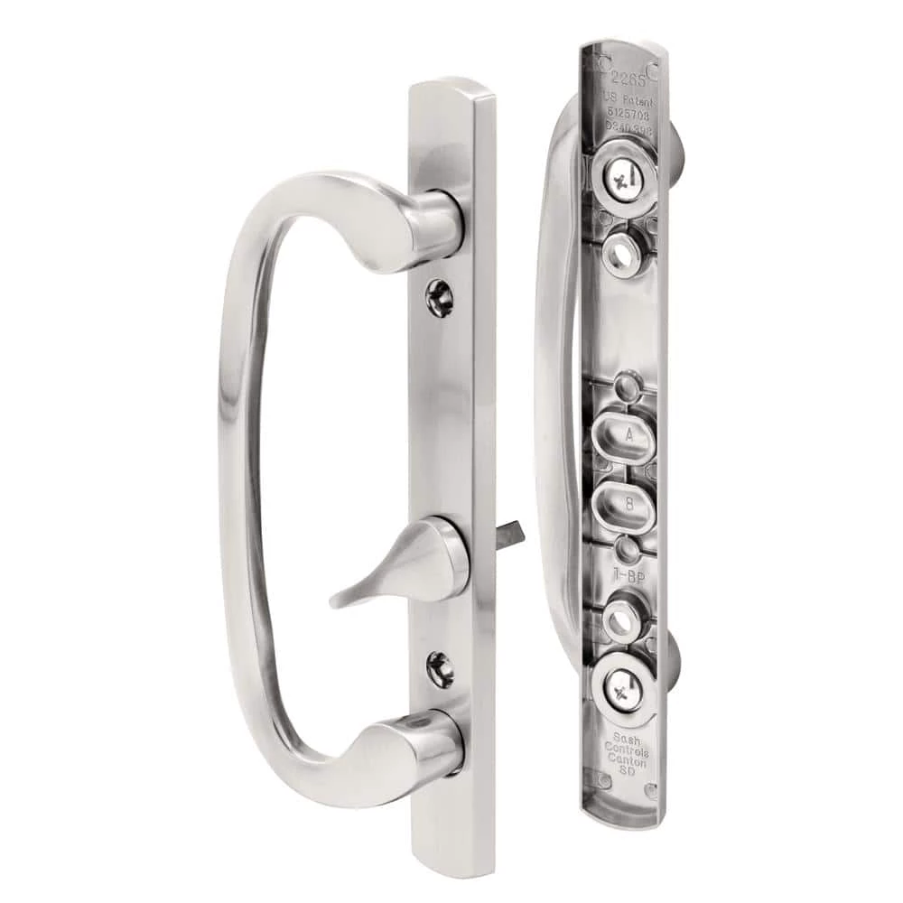 This patio door handle set has matching inside and outside pulls, with offset thumb turn/ lever. Features a satin nickel finish that is non-handed and used by a variety of manufacturers. This is a low profile non-keyed handle set that can be keyed.