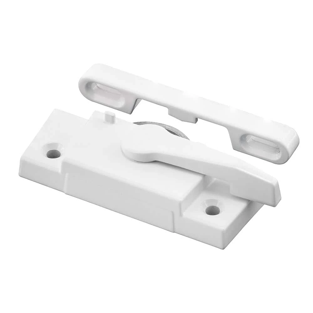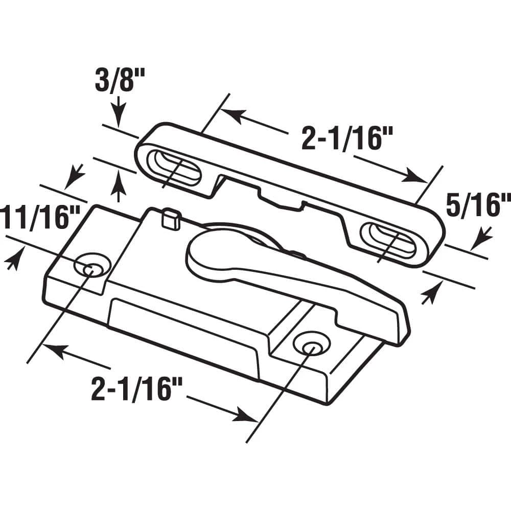 This is a left hand window sash lock. It is a diecast construction that is powder coated white and features a low profile design. Mounting holes are 2-1/16 in. on center and a 11/16 in. hole backset. Face mounted keeper, used on Better Bilt (350 Series) single hung vinyl windows.