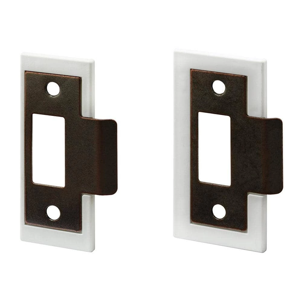 This Fix-A-Latch, strike plate repair kit is constructed of stamped steel and white plastic components, and it comes in a bronze-plated finish. This kit can be used to easily repair a door that fails to latch when it is closed. The kit includes a strike plate for use with a 1-3/8 in. thick interior door, and another for a 1-3/4 thick exterior door. The white plastic bases come with adhesive-back tape strips and installation fasteners for a quick and simple repair. Note: These Fix-A-Latch repair plates require a 1/8 in. clearance gap between the doorjamb and the closed door’s edge.