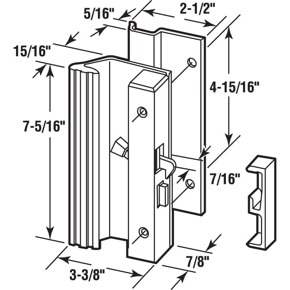 This black finish patio door handle is a surface with hook latch style. Often found on older style patio doors, it is mounted on the door’s inside frame and the hook latch engages the keeper mounted on the jamb. It has a 7/8 in. low height extruded aluminum inside handle with an anti-lift feature on the hook latch which has a 7/16 in. profile. Mounting holes are 4-15/16 in. on center. The outside handle is a low profile non-keyed extruded pull. It can be keyed by installing Prime-Line part E 2071.