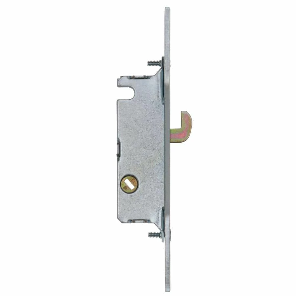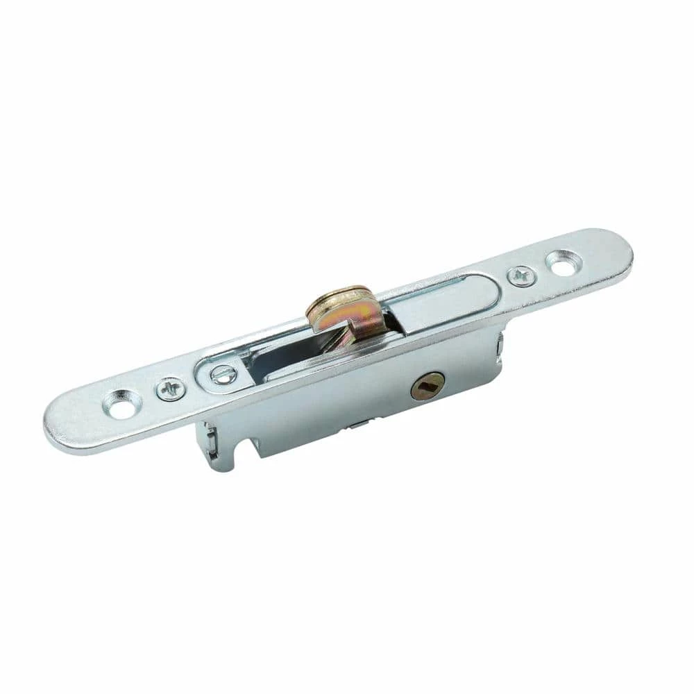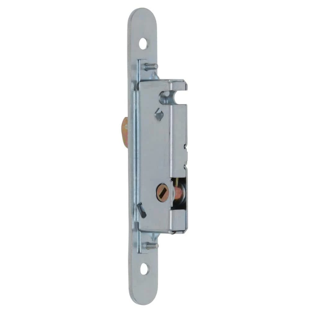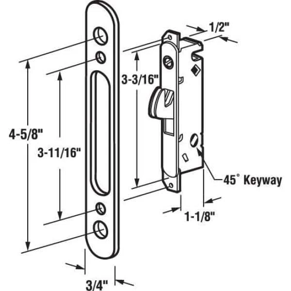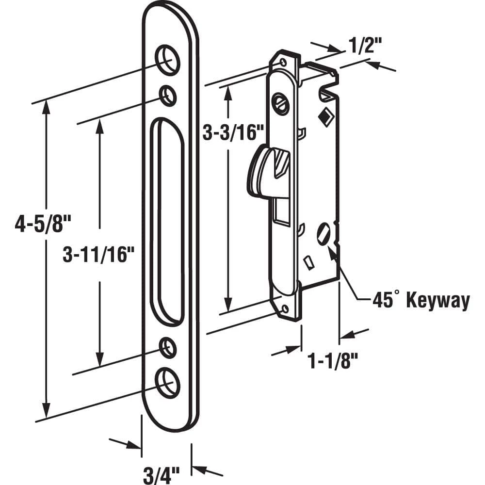 Keep your sliding patio door secure with this Rounded Faceplate Mortise Lock. The steel housing and hook have a round end faceplate with mounting holes at 4-5/8 in. and 3-11/16 in. on the center. The keyway is at 45 degrees with the hook fully extended. For use on wood and vinyl patio doors.