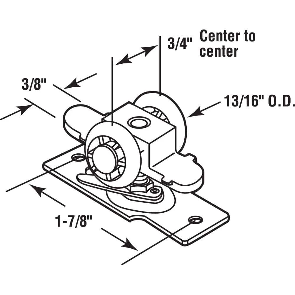 This pocket door roller assembly is constructed of a steel bracket and ball bearings with plastic tires. The bracket’s hole center spacing measures 1-7/8 in. and it features 2 parallel wheels that are spaced apart at 3/4 in. on center. The wheels are constructed of durable plastic which provide for a smooth, long-lasting, quiet operation, and they feature 13/16 in. diameter convex edges. These adjustable roller assemblies mount on the tops of pocket doors, and they are used by Kenna-frame, Crawford, Press-Rite Doors, and a variety of other pocket door manufacturers. These roller assemblies have a 100 lb. max. capacity. This roller assembly fits into a 1 in. wide track.