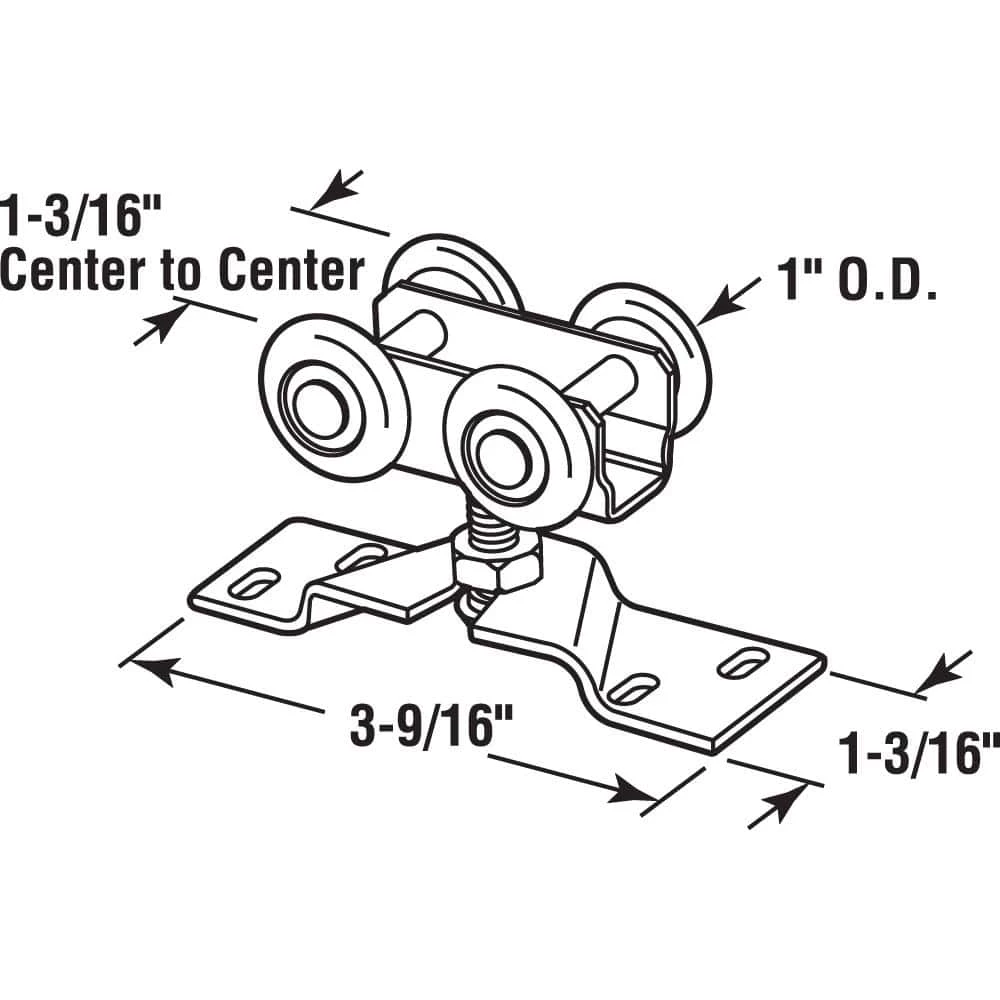 This pocket door roller assembly includes 4 nylon constructed wheels. They come affixed to an adjustable steel bracket that mounts to the top of your door. This roller fits 1-3/16 in. center to center double J-style track systems.