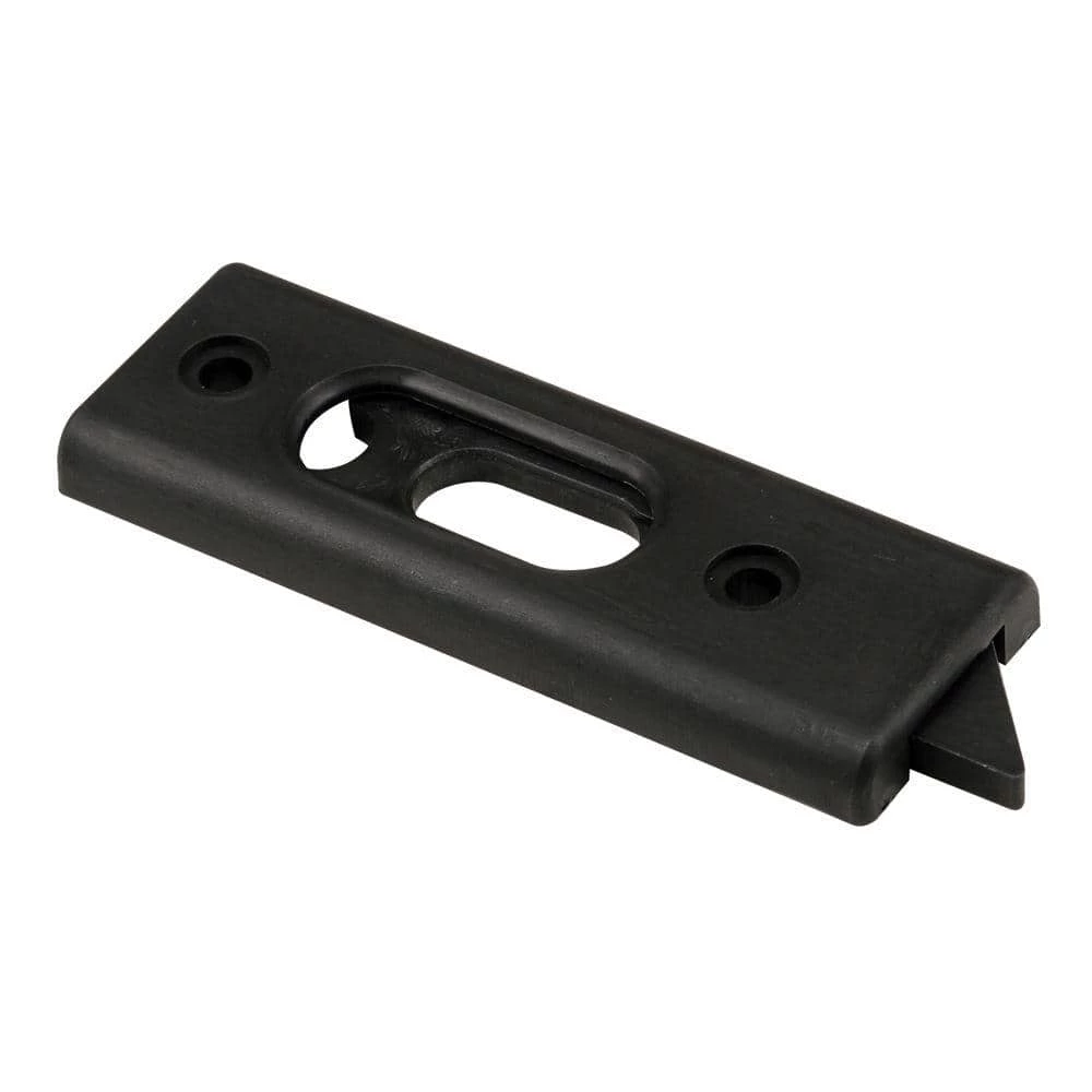 This vinyl window tilt latch is constructed from black plastic. It features a spring-loaded latch. This style tilt latch is used by several window manufacturers.