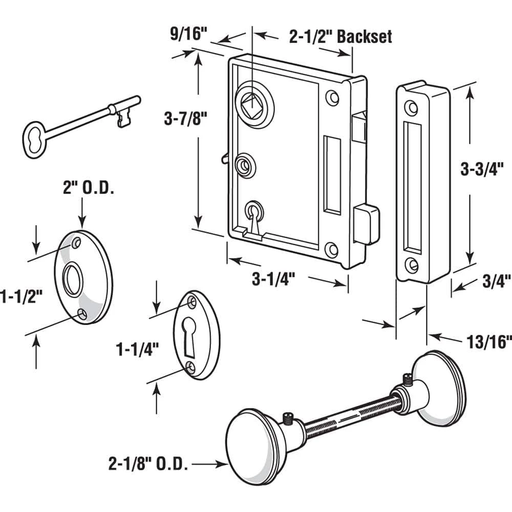 - 3-1/4 in. x 3-7/8 in. case lock, 13/16 in. x 3-3/4 in. keeper, 2-1/8 in. outside diameter knobs, 2 in. outside diameter rosettes